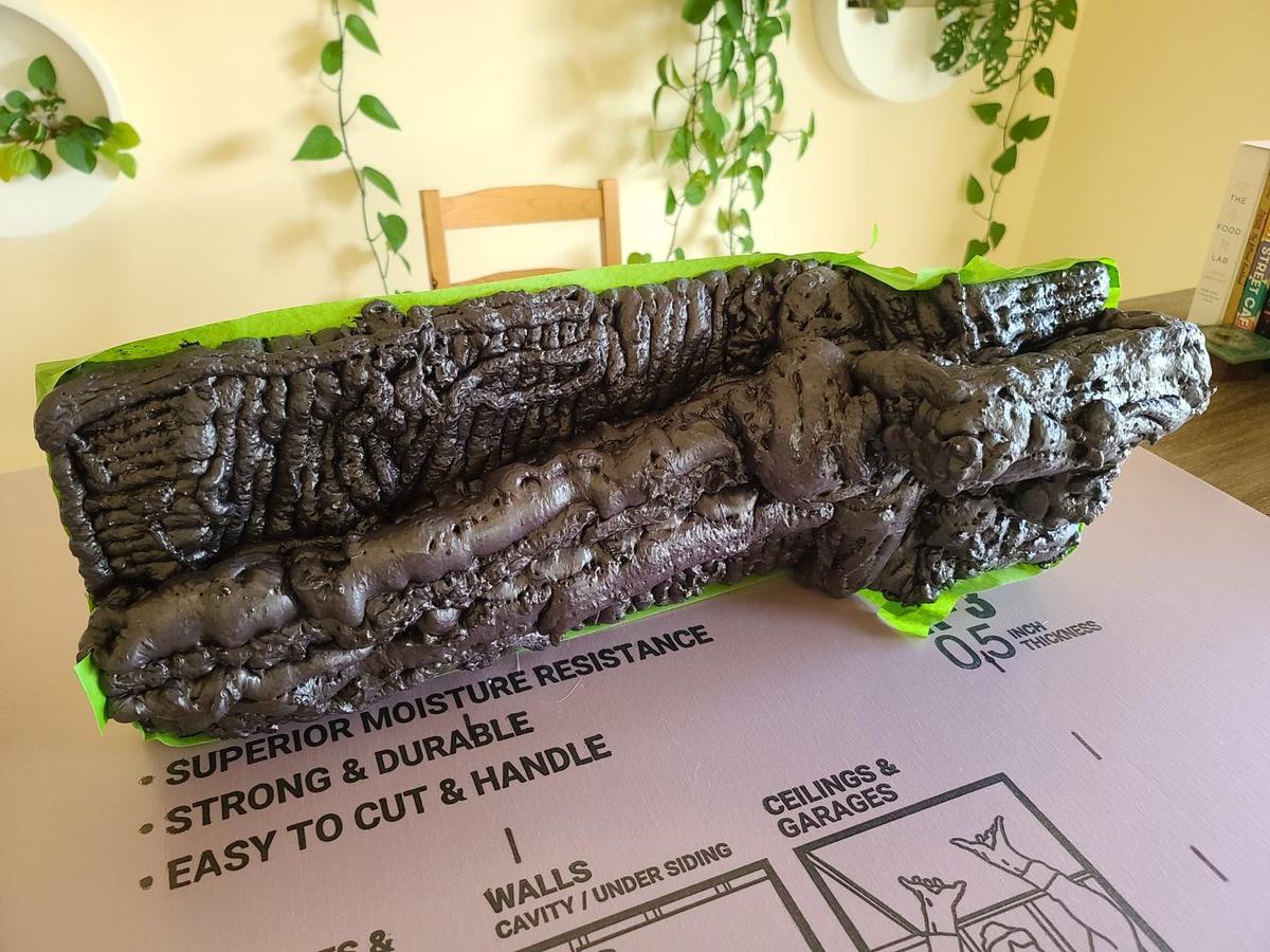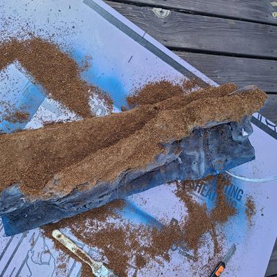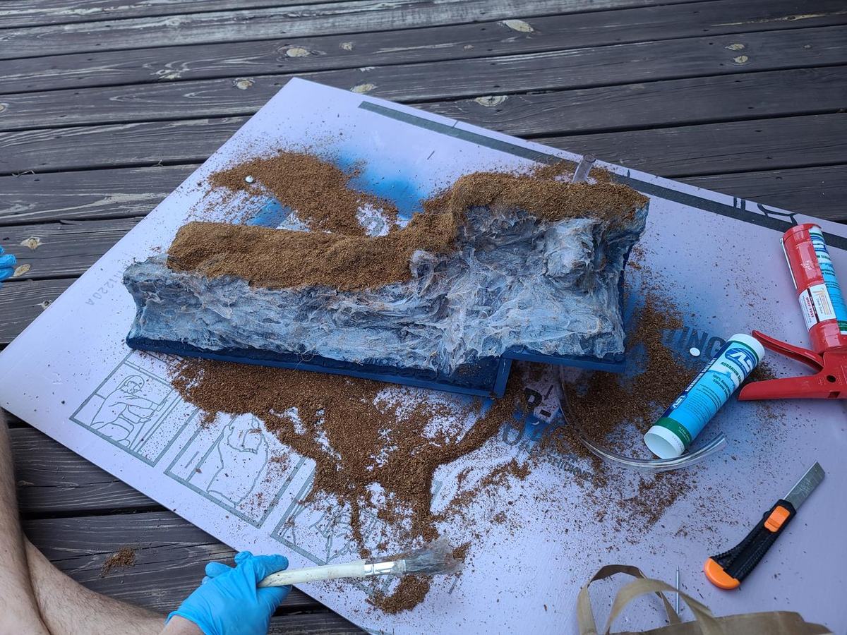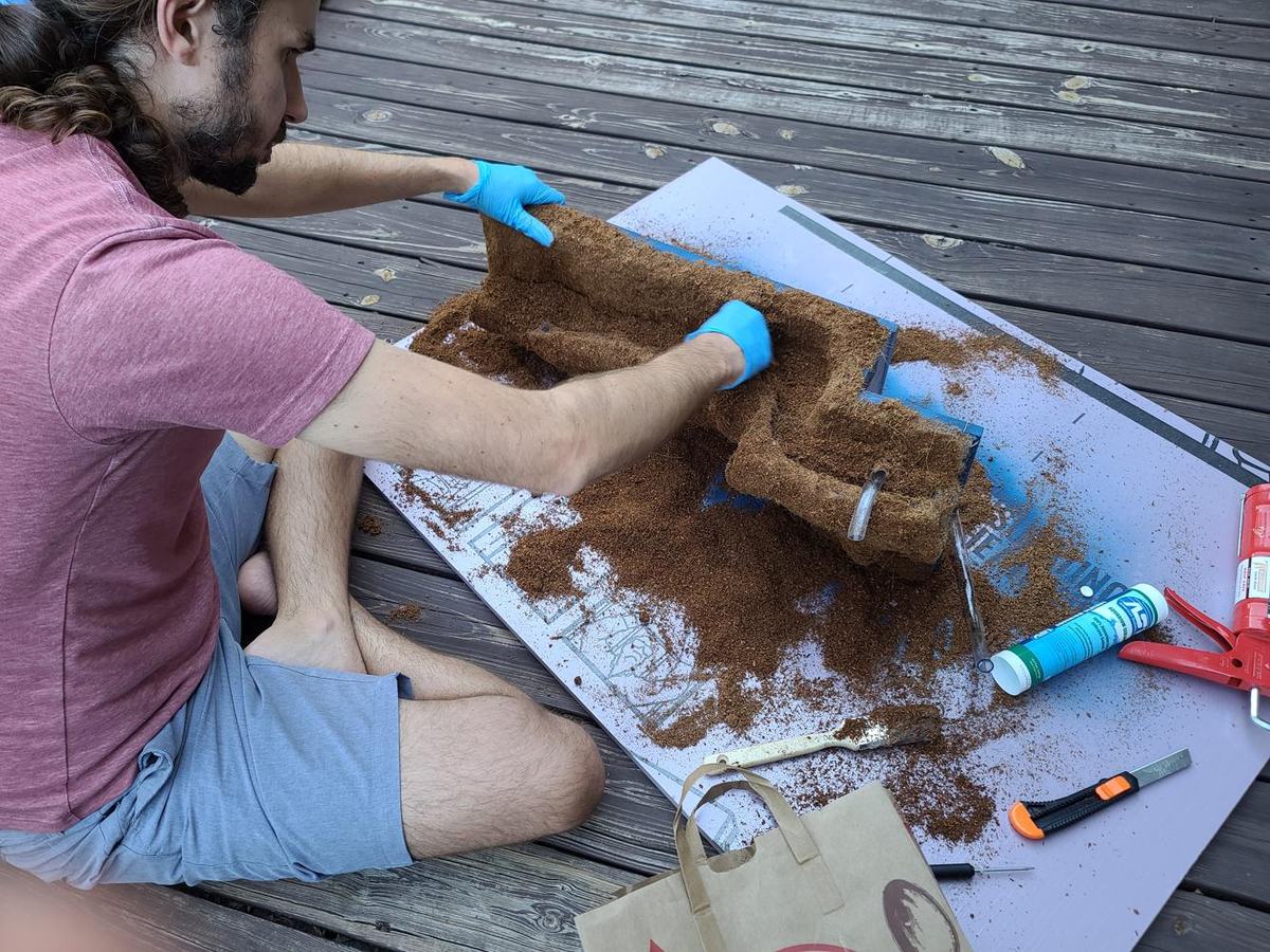 Once I cut the expanding foam down to shape I was looking for, I coated the surface with silicone and pressed coconut fibers into it. I also created an opening and inserted a tube for the water supply to the top of the waterway, sealing it with more silicone.