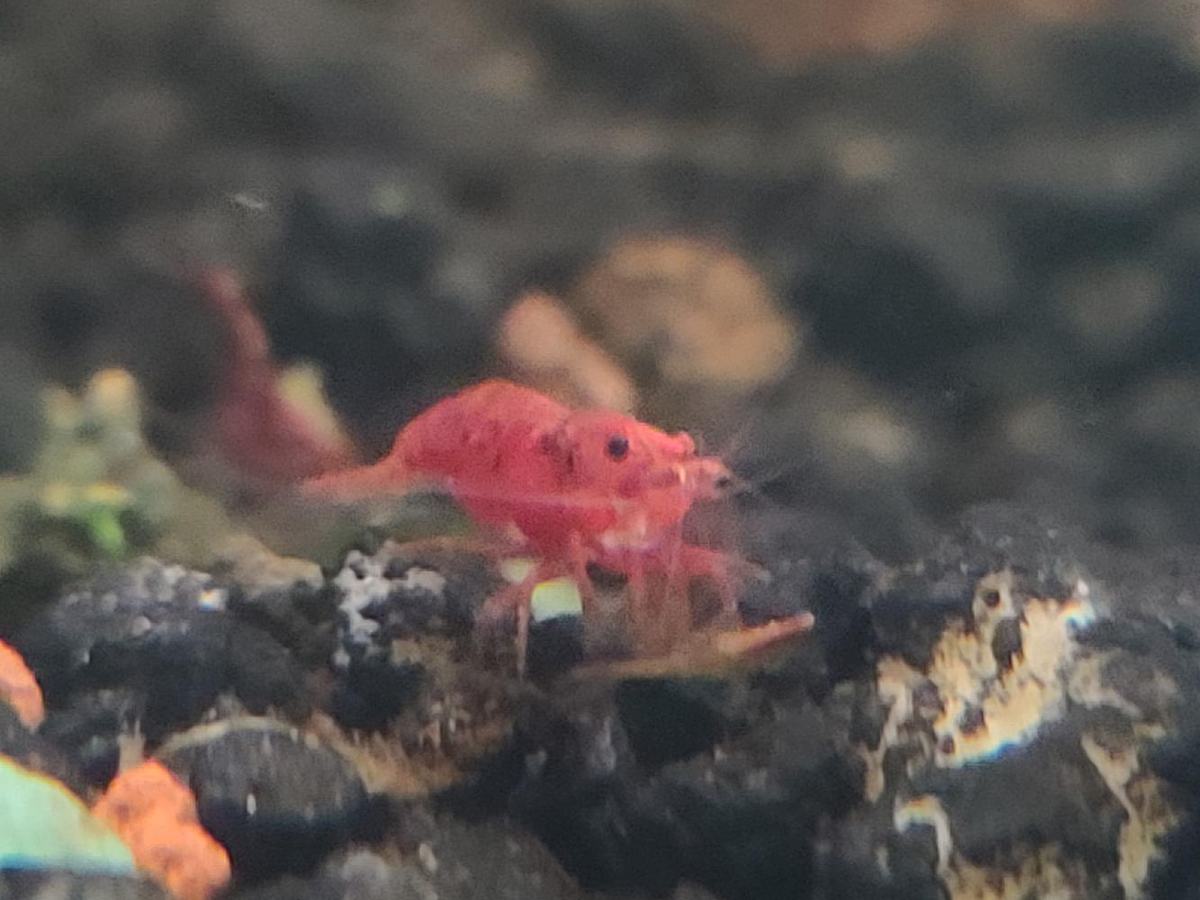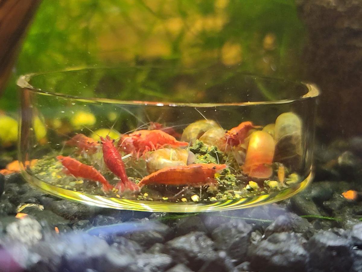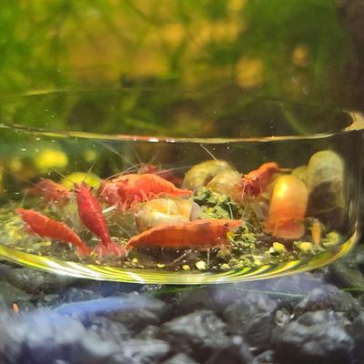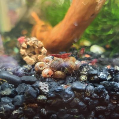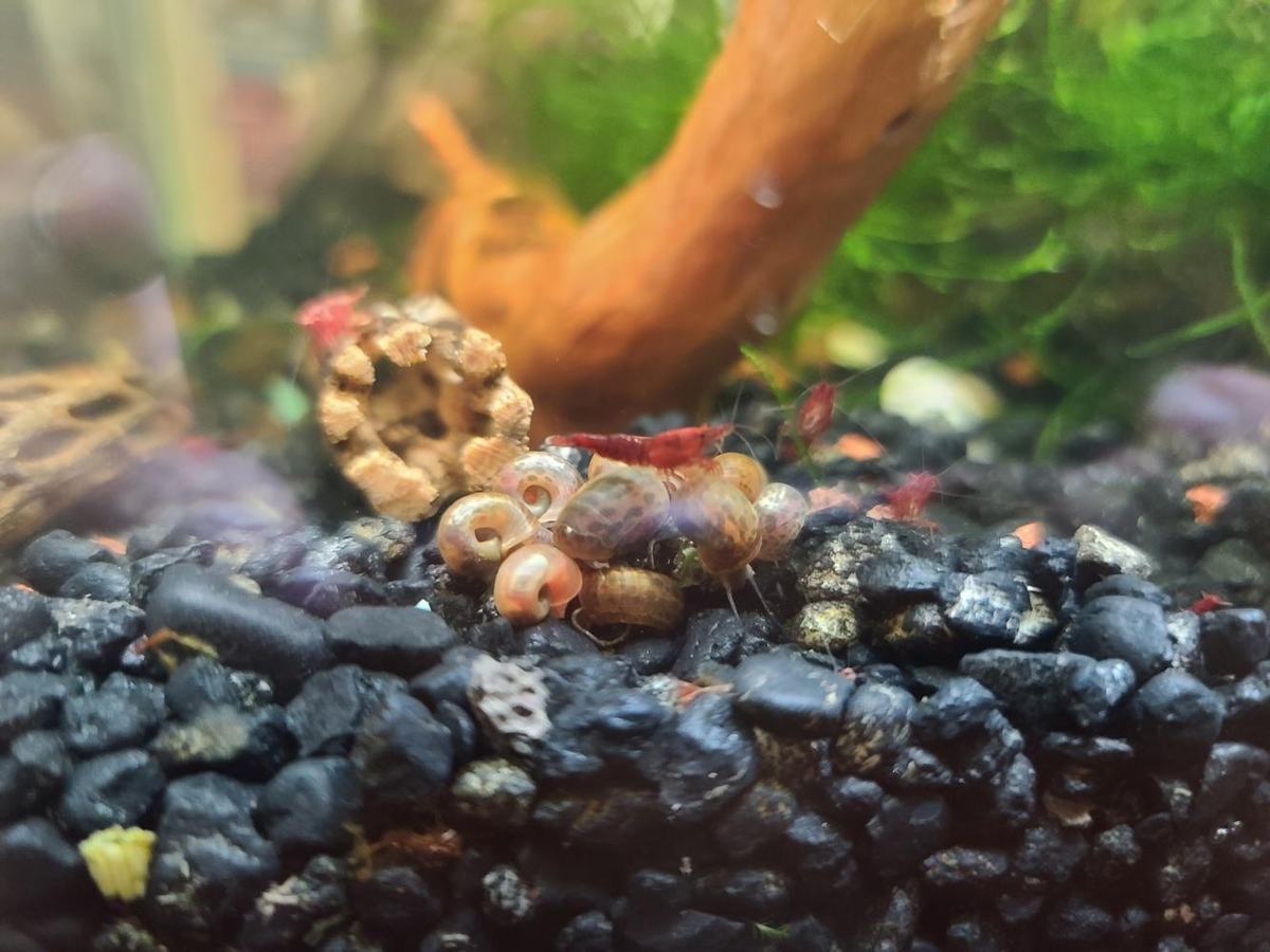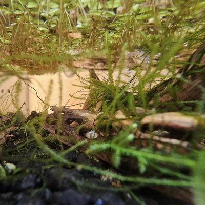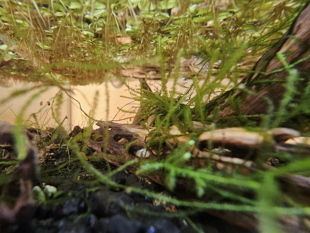 Before adding aquatic animals, I needed to establish the bacteria that process the animal waste products. This is called cycling. I cycled the tank for about 10 days, which may have been a bit on the short side, but the bioload I was adding was pretty small, just ten Red cherry shrimp and a few ramshorn snails. I also added Salvinia, a floating plant, and Java Moss. I didn't really know what to do with the Java Moss, so I just threw it in the water. Most of it died after a few months, but the Java Moss that landed on various surfaces stayed alive, and now it's growing along a bunch of different surfaces underwater, and even out of the water a bit. After a month or so I noticed a different species of snail than what I put it, so it must have hitched a ride with some of the plants.