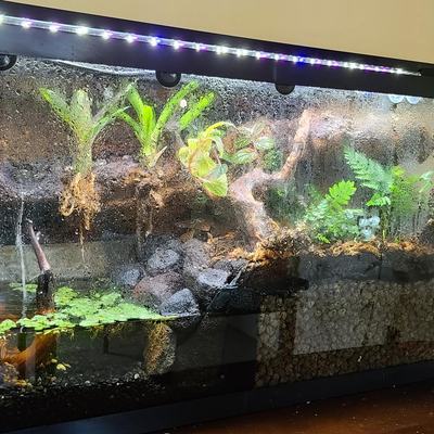 I wanted to plant the tank fairly heavily such that nitrates would be readily pulled out of the water, reducing the need for water changes. For the plants I got two small Neoregelias, a Begonia ulmifolia, a Pellionia pulchra, a variety of Peperomia, and two other fern species that I can't identify. I largely chose these on a whim, just looking at what others seem to put in Paludariums. I attached the Neoregelias to the backdrop with toothpicks, and planted the rest in the soil. I also spread a live moss slurry over the backdrop. This starts off as just a brown goo, but eventually grows into a thicker blanket of moss. I also spread some leaf litter on the ground around the plants. I added springtails and some terrestrial isopods to the paludarium. These are the "Clean-up crew". They eat dead plant matter, mold, and generally keep the paludarium clean and healthy.