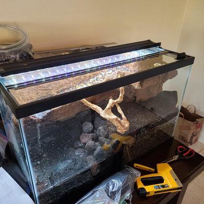 Once the silicone had cured and aired out, it was time to assemble. I rinsed the backdrop thoroughly and attached it to the inside of the tank with silicone on the glass. I split the base of the tank into two sections, separated by sponge filter. On the water side I laid down aquarium gravel, and on the land side I laid expanded clay up to slightly above water level (the false bottom), and then laid a substrate barrier (basically a piece of synthetic fabric) and then dirt on top. I placed lava rocks against the sponge filter on the water side, to improve the appearance and give a place for the future inhabitants to hide. I hooked up the pump system such that water flowed down the waterway and over the waterfall, and set up the misting system to spray mist into the tank a few times a day. I also placed a few pieces of spider wood, one in the water, and one that I placed in the soil, and glued to the backdrop.