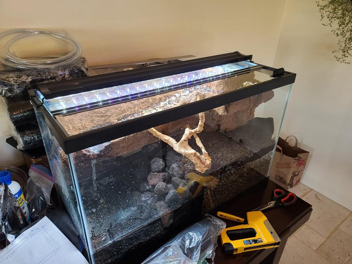 In October of 2022 I decided to make a Paludarium. A paludarium is like a mix between a terrarium and an aquarium. (The name comes from the latin word "palus", which means marsh.) I'm really into gardening and houseplants, and I've always been interested in getting an aquarium. When I learned about paludariums I knew I wanted to build one. I also was very interested in the idea of creating a somewhat stable ecosystem, minimizing the need to change the water and add food, with the main input just being light. I'm not a purist about this, but it is something I try to work towards.