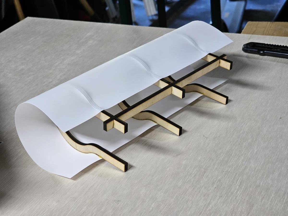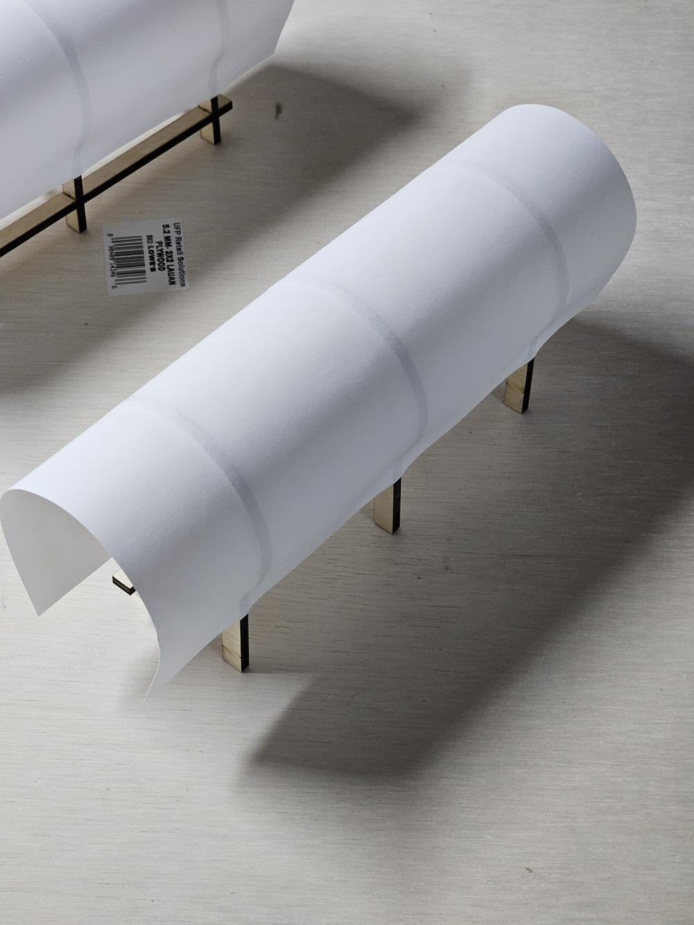 The light fixture is mounted to a horizontal 2x4 in my garage, so the bracket just press fits around the board. I made 5 brackets and glued paper to them, then lined them up on the light fixture.