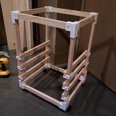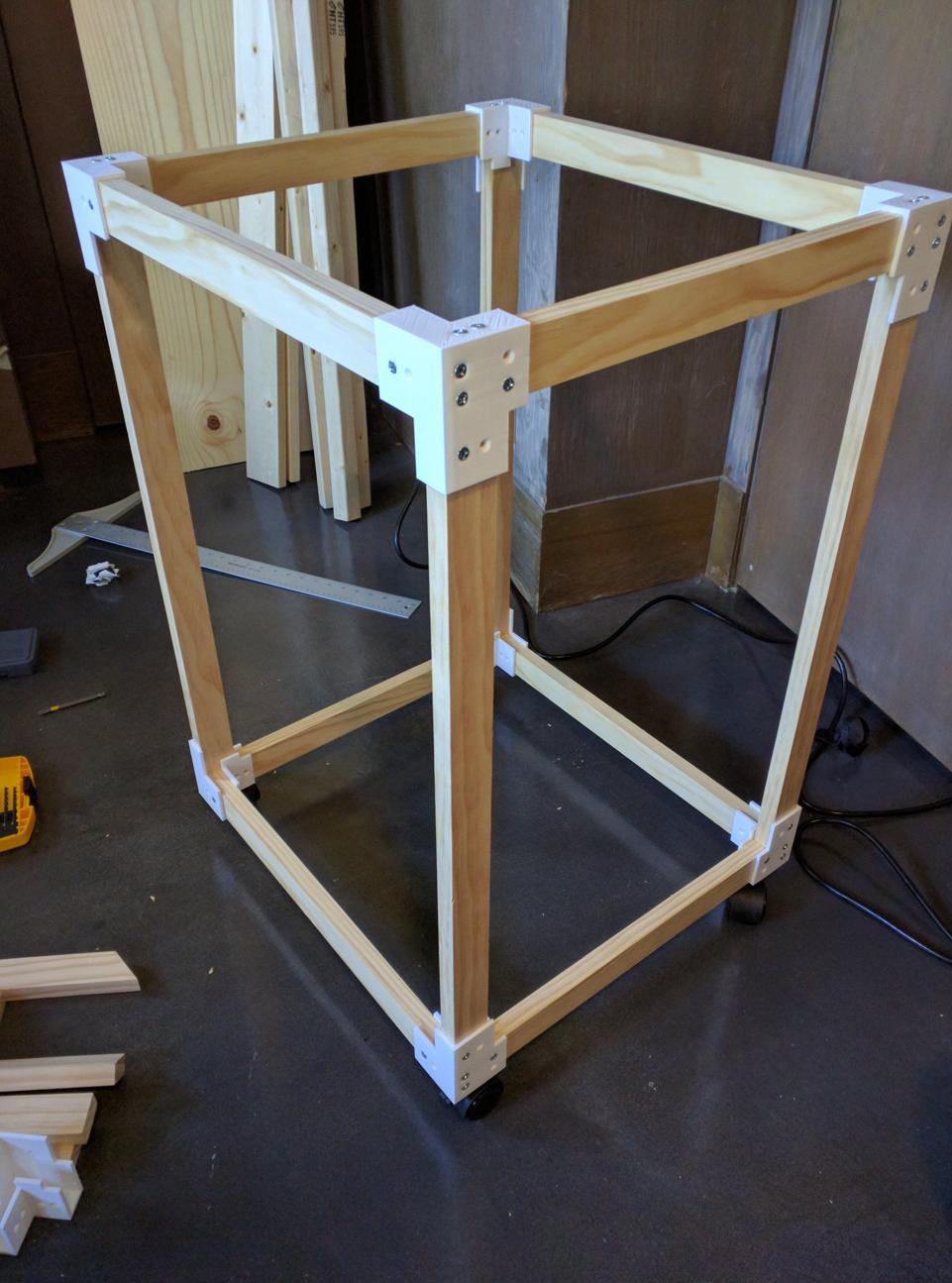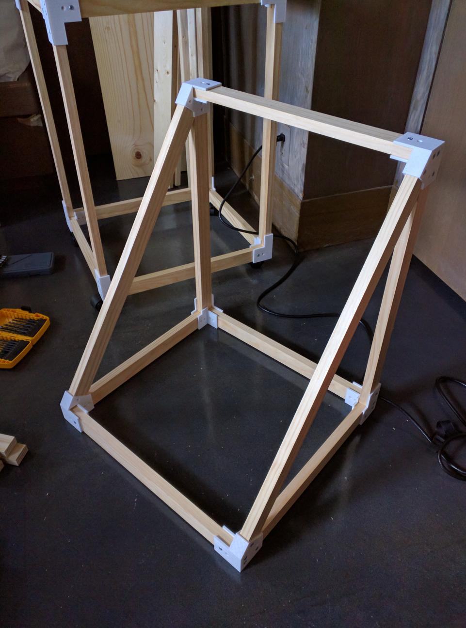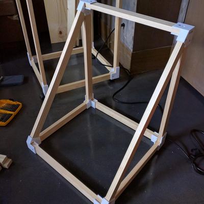 I first designed the frame. At ~2 hours printing time per joint, this ended up being a fair amount of printing, but I had it done in a day or two. After cutting the wood to length, I was ready to begin assembly.
