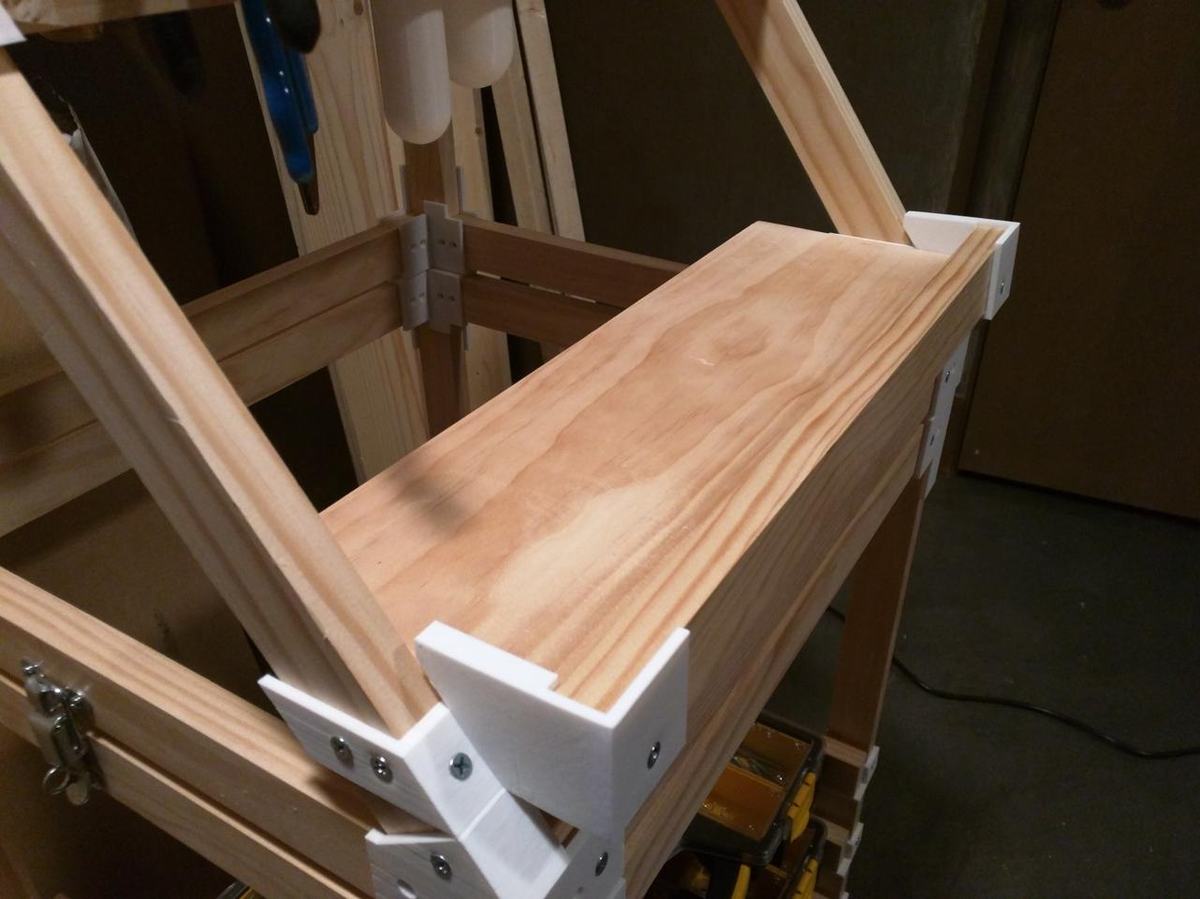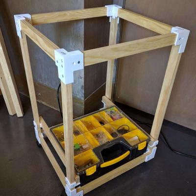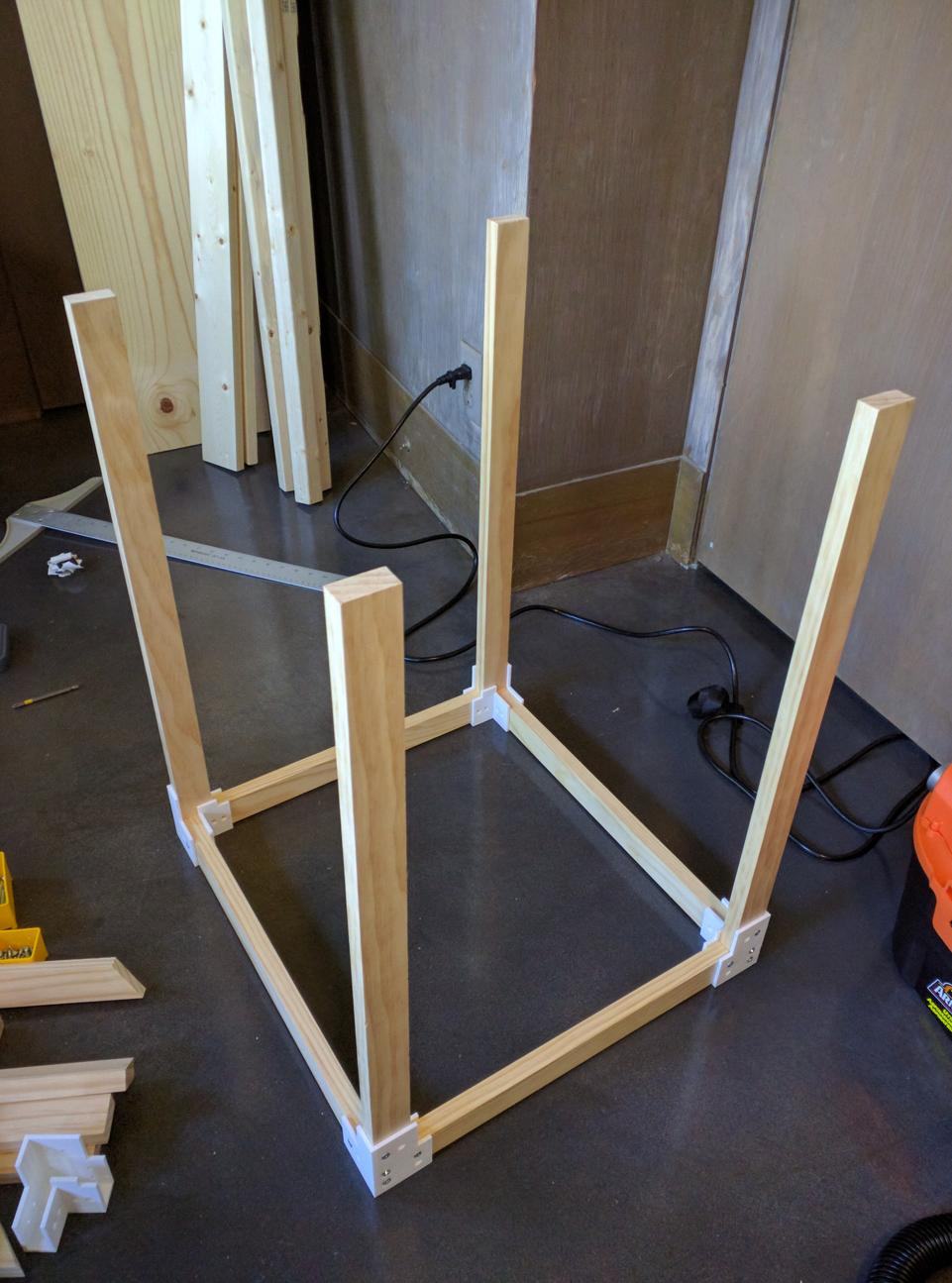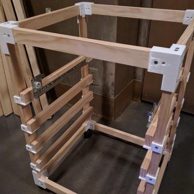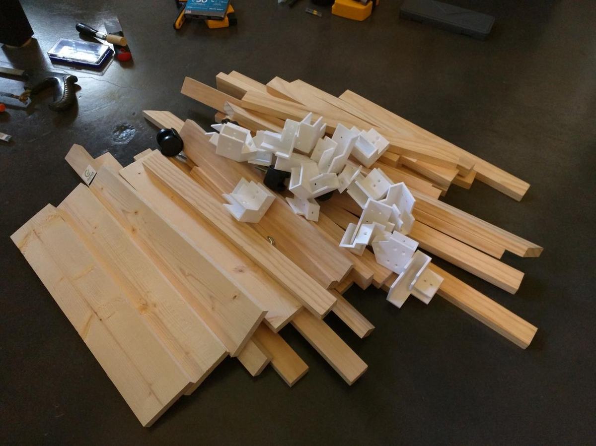I first designed the frame. At ~2 hours printing time per joint, this ended up being a fair amount of printing, but I had it done in a day or two. After cutting the wood to length, I was ready to begin assembly.